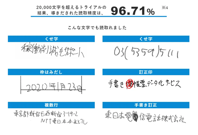 手書き書類や帳票の文字を、AI技術を使って読取・データ化するOCRサービスです。高い読取精度(96.71%)、マウスの操作だけで読取設定が可能な使いやすさが特徴です。