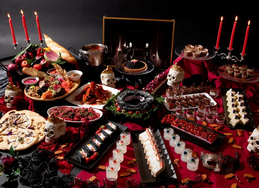 今回のロレーヌのスイーツバイキングは、昨年(2018年8月)開催した「スイーツ・オブ・ドラキュラ」の復活をテーマとし、十字架やコウモリをあしらったスイーツに加えて、悪魔の「辛さ」と天使の「甘さ」の世界観を感じていただけるメニューをお楽しみいただきます。甘いスイーツとスパイシーな辛さの料理を店内の古城を思わせる絵画や妖艶なバラなどを装飾した、雰囲気の中でお楽しみください。