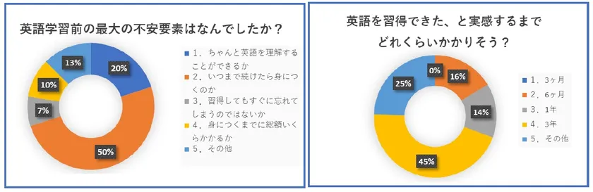 調査結果によると、50%もの方が不安に感じているのが「いつまで続けたら英会話が身につくのか」であるということがわかりました。なお、「英語を習得できるまでどのくらい時間がかかると思うか」という質問に対して、「3年」もしくは「その他」と答える人が全体の7割に達しているのがわかります。