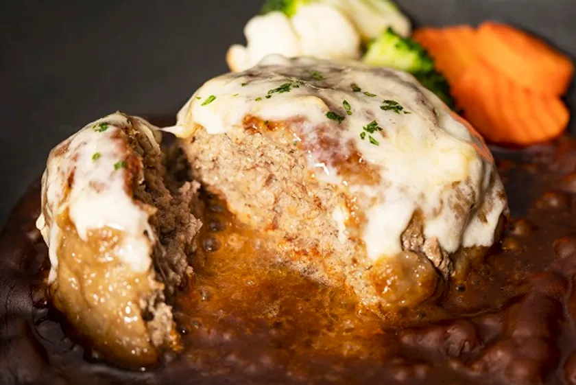 A5ランクの国産黒毛和牛のみを使用したハンバーグの肉汁とチーズのコクがマッチ。