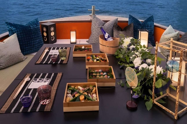 各施設が独創的なテーマで、圧倒的非日常を提供する「星のや」。東京・大手町の日本旅館「星のや東京」は、2022年6月1日~8月31日の期間、夏の宵に貸切舟の上で夏酒と老舗料亭の四段重を味わう「お江戸船上夕涼み」を開催します。江戸の夏の風物詩だった「大川(隅田川)の涼み」。当時の人々は、川沿いの料亭が旬の魚介類や野菜、押し寿司や甘味などで仕立てた四段重を舟に持ち込み、夏の宵を楽しんでいました。(*1)本アクティビティでは、その当時の文化(*2)になぞらえ、創業90年の老舗料亭「つきじ治作」が特別に仕立てた四段重を、夏酒とともに味わえます。江戸風鈴や水団扇などを設えた開放的な桟敷席で眺めるのは、刻々と移り変わる東京の景色。酷暑厳しい現代の東京で、涼やかな夏のひとときを過ごせます。