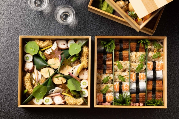江戸の夏の風物詩だった「大川(隅田川)の涼み」。当時の人々は、川沿いの料亭が旬の魚介類や野菜、押し寿司や甘味などで仕立てた四段重を舟に持ち込み、夏の宵を楽しんでいました。(*1)本アクティビティでは、その当時の文化(*2)になぞらえ、創業90年の老舗料亭「つきじ治作」が特別に仕立てた四段重を、夏酒とともに味わえます。「つきじ治作」は、隅田川に堤防が建設される前、岸辺から舟へと料理を出していた料亭です。桟敷席で水辺の涼やかな風を感じながら、老舗の味わいに舌鼓を打てます。