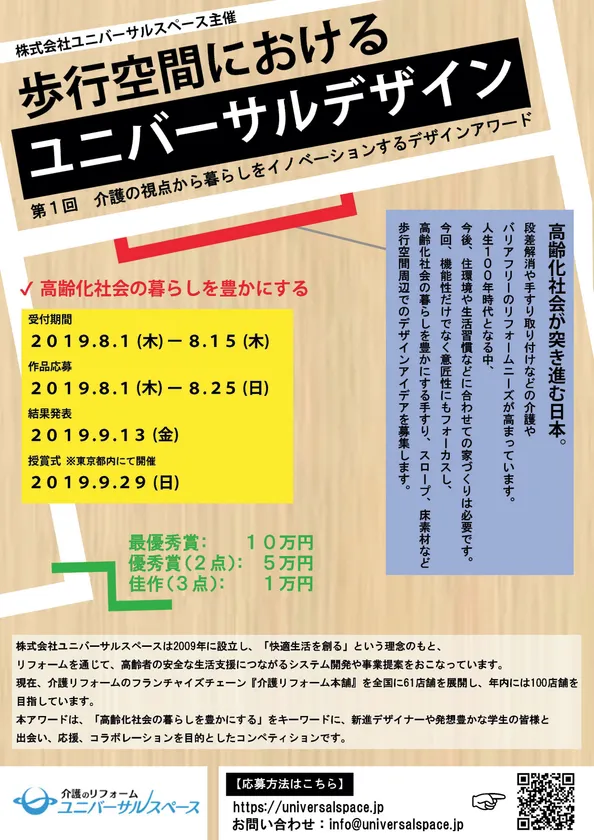 介護向け住宅リフォーム事業を行う株式会社ユニバーサルスペース(本社:神奈川県横浜市、代表取締役:遠藤 哉)は、『第1回 介護の視点から暮らしをイノベーションするデザインアワード』を開催します。