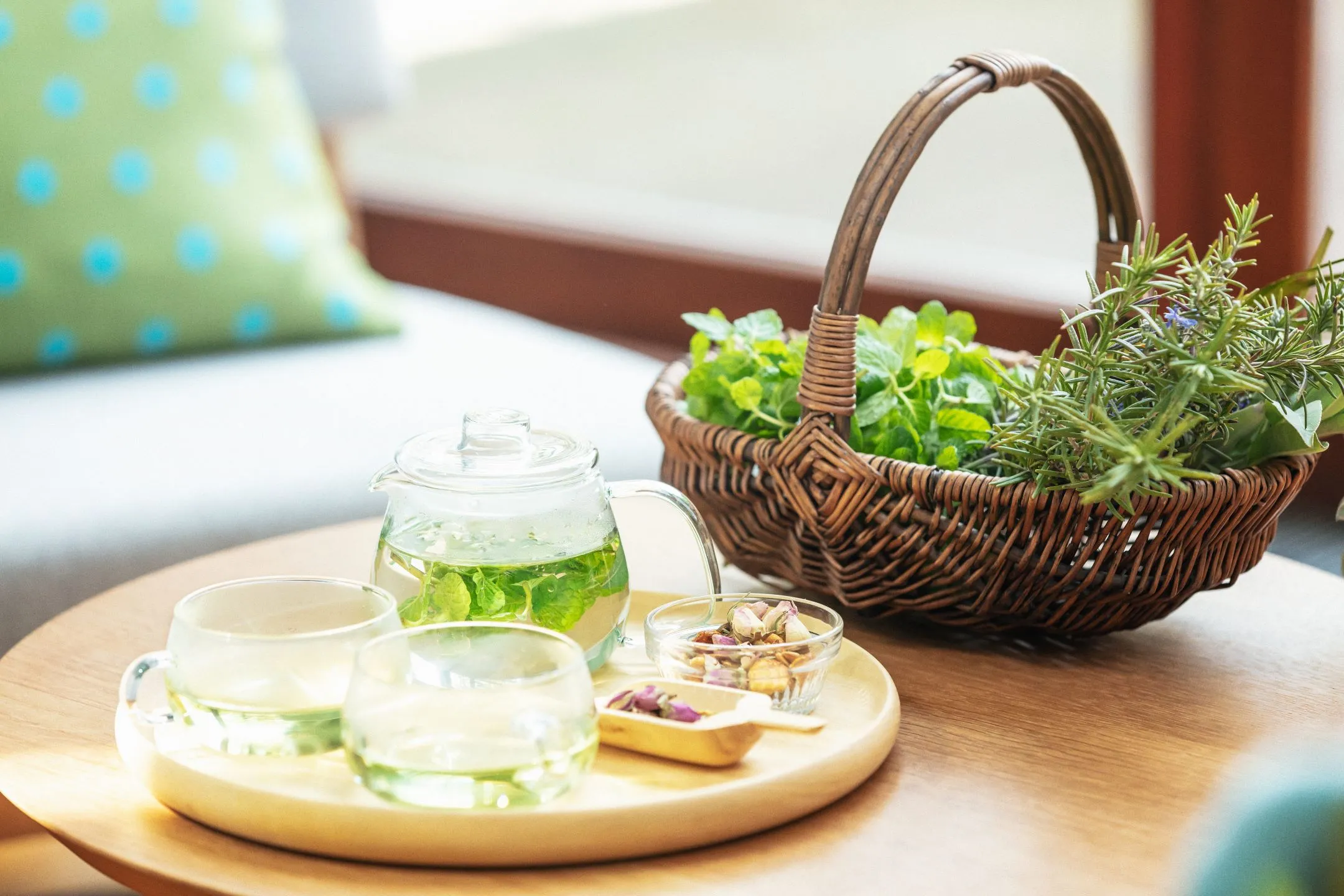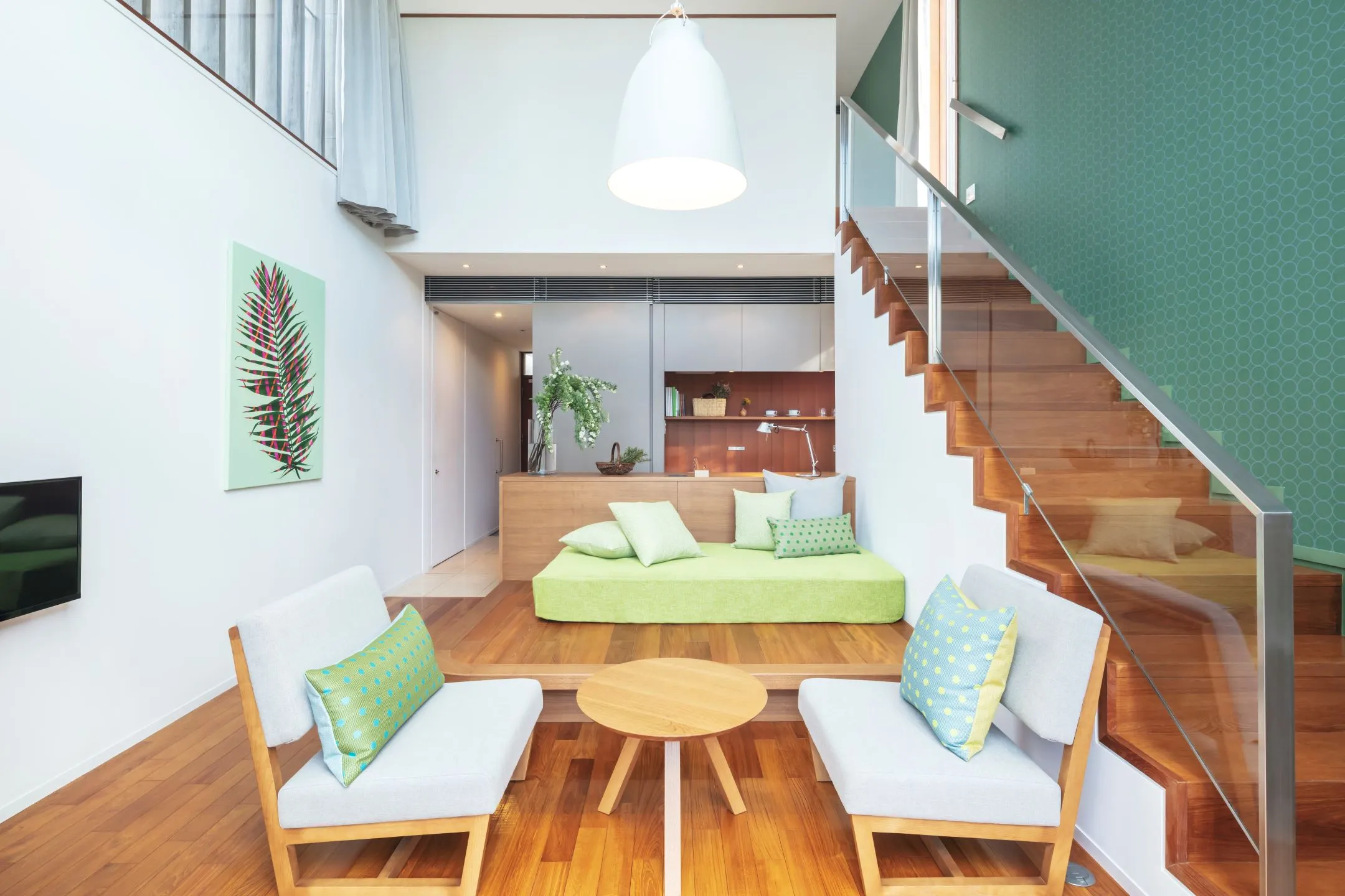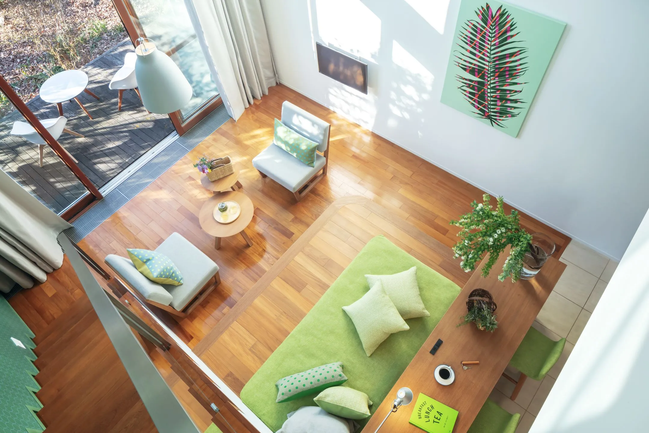 デラックスメゾネットは、一階にリビングスペース、二階にベッドルームを設えた70平米の広々とした客室です。バーテーブルやソファの他に、両階にテラスがあり、カップルからグループまで、さまざまなシーンに合わせたくつろぎ方を提案します。また、緑をテーマカラーとした客室は、那須に生い茂る木々をイメージ。大きな窓越しに見える大自然に包み込まれるような、リラックスできる空間です。
