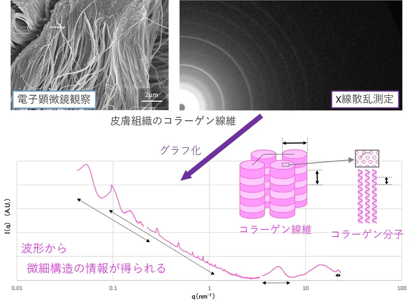 また、電子顕微鏡での観察は、狭い範囲を画像化したものであるため、コラーゲン線維の全体の構造を数値化することが困難でした。しかし、X線散乱測定では、X線を照射した領域で発生する散乱X線をまとめて評価するため、広い範囲の平均データを一度に得ることができます。結果が数値で得られるため、例えば、加齢によるコラーゲンの質的変化を数値化して老化状態を把握することも容易になります。