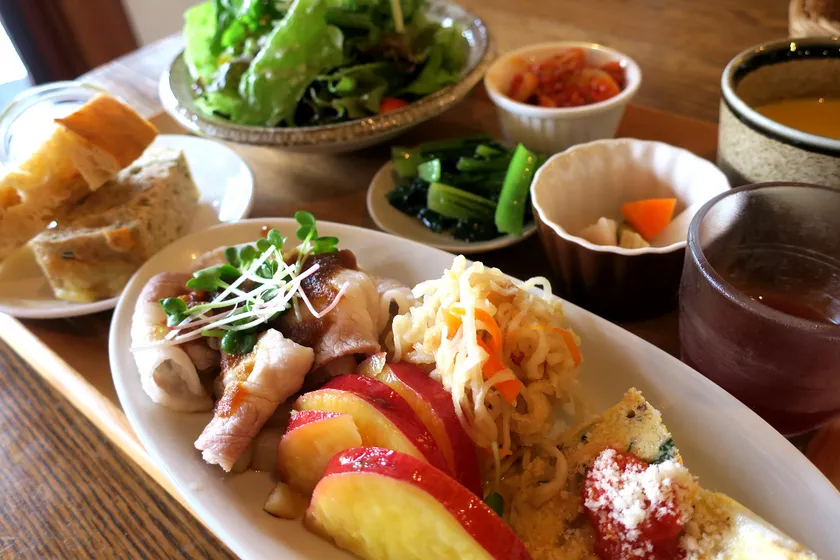 野菜のお惣菜を7種揃えた一汁七菜ランチが、野菜をたっぷり取れると好評です。