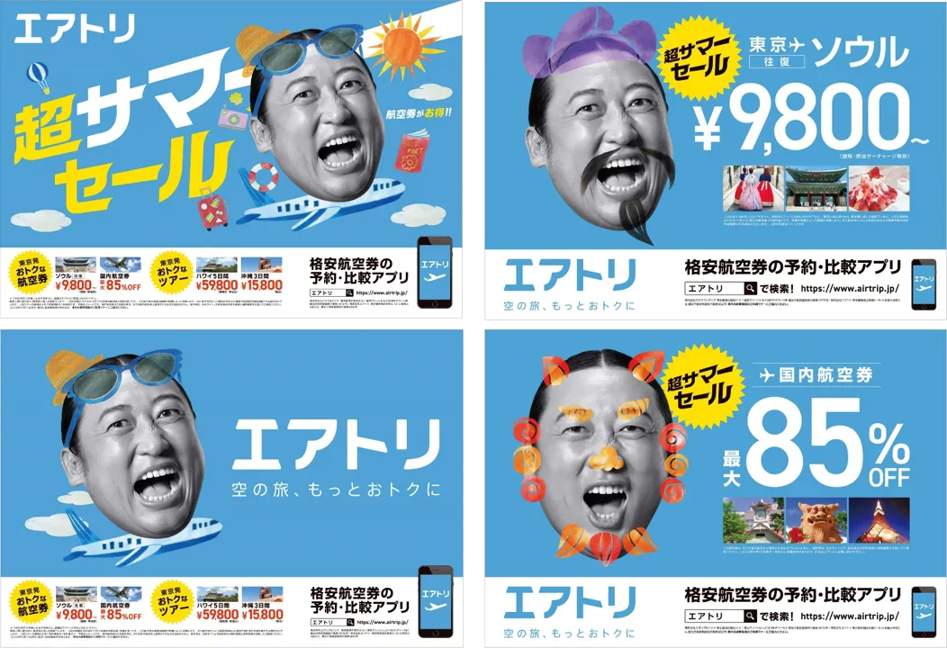 今回掲出する広告は、夏の旅行を特別価格で取り揃えている超サマーセールを訴求する内容となっており、ロバートの秋山竜次さんの表情豊かな大きな顔が印象的で、JR首都圏の全車両に4枚ずつ掲出され、目を引くポスター広告となっています。