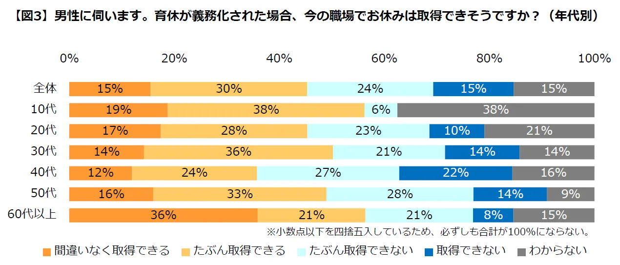 男性に「もし育休が義務化された場合、今の職場でお休みは取得できそうですか?」と伺うと、39%が「取得できない(たぶん取得できない:24%、取得できない:15%)」と回答。年代別では、40代の49%が「取得できない(同:27%、22%)」と回答。「取得できる:36%(間違いなく取得できる:12%、たぶん取得できる:24%)」を上回る結果に。仕事上でも重要な役割を担う方も多い世代のためか、40代男性にとっては現実的な問題として取得を考えにくい状況のようです。