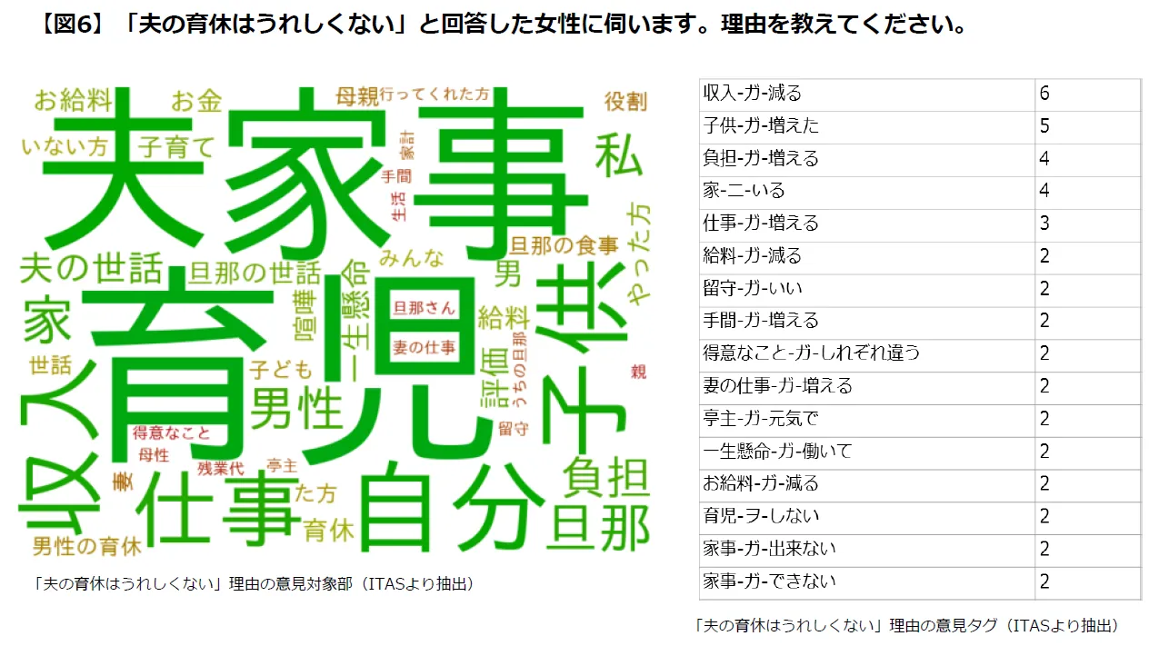 3:女性の7割は夫の育休取得に前向き。収入減や家事負担を懸念し、反対する声も。(図5、図6)