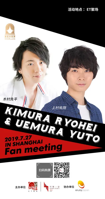 株式会社ENJOY JAPAN(東京都新宿区、代表取締役:瞿 史偉)は、SMG上海歓劇一堂文化伝媒有限公司(上海市黄浦区、総経理:陳 緋)が運営するET劇場にて、声優イベント『KIMURA RYOHEI & UEMURA YUTO FAN MEETING in Shanghai 2019』を2019年7月27日(土)に開催いたします。