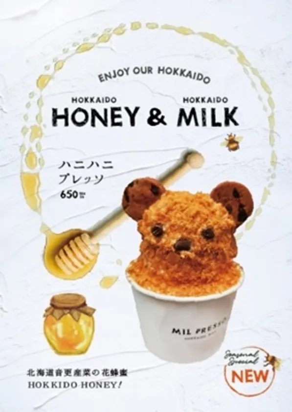 見た目がとっても可愛いクマさんは、ソフトクリームの周りをパイ生地でコーティングしているのでサクサク食感をお楽しみいただけます。一緒についてくるお魚は、クマさんの大好きな「北海道の鮭」をイメージしていて、中には十勝・音更町の菜の花畑で採れたはちみつが入っています。「ハニハニプレッソ」まずは、そのままお召し上がりください。お好きなタイミングでクマさんのはちみつをお好みでかけ、パイ生地とソフトクリームに絡めてお召し上がりいただきます。また中のソフトクリームは、MIL PRESSO自慢の「おこおこプレッソ」です。甘さ控えめで牛乳の濃厚な美味しさがダイレクトに伝わる当店人気No.1のソフトクリームです。