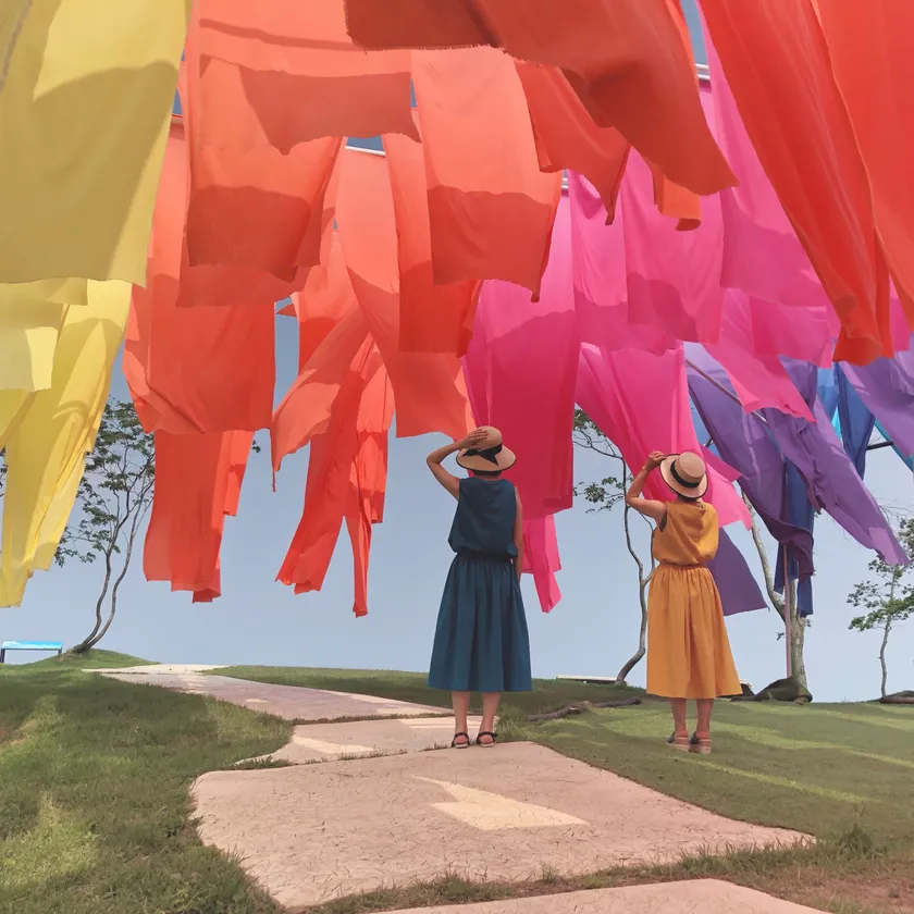 琵琶湖を彩る新スポットの誕生です。ここでは、地域の気候の特徴「高島時雨」により頻繁に虹がかかります。その虹を、江戸時代から続く伝統産業である「高島ちぢみ」で織りあげました。横20m、奥行12mの長さ4mの生地が約200枚、風にそよぐ大きなカーテンを通り抜けると、琵琶湖と空の大パノラマが広がります。