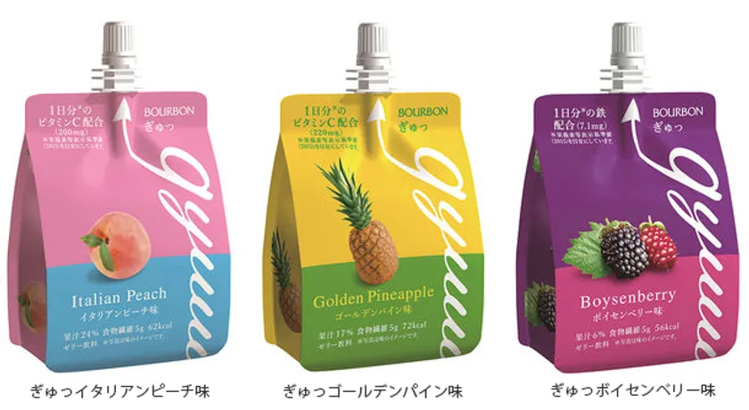 株式会社ブルボン(本社:新潟県柏崎市、代表取締役社長:吉田 康)は、濃厚な果汁感と1日分の栄養素(ビタミンC、鉄)が摂取できるパウチタイプのゼリー飲料「ぎゅっ」シリーズ3品を2019年7月9日(火)に新発売いたします。