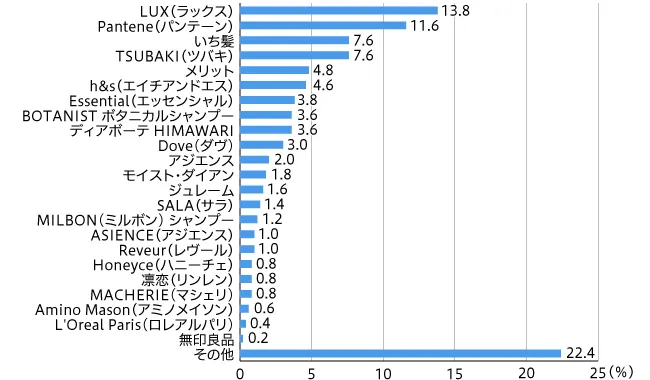 使用しているシャンプーはラックスが最も多く13.8%、次にパンテーン(11.6%)が続く