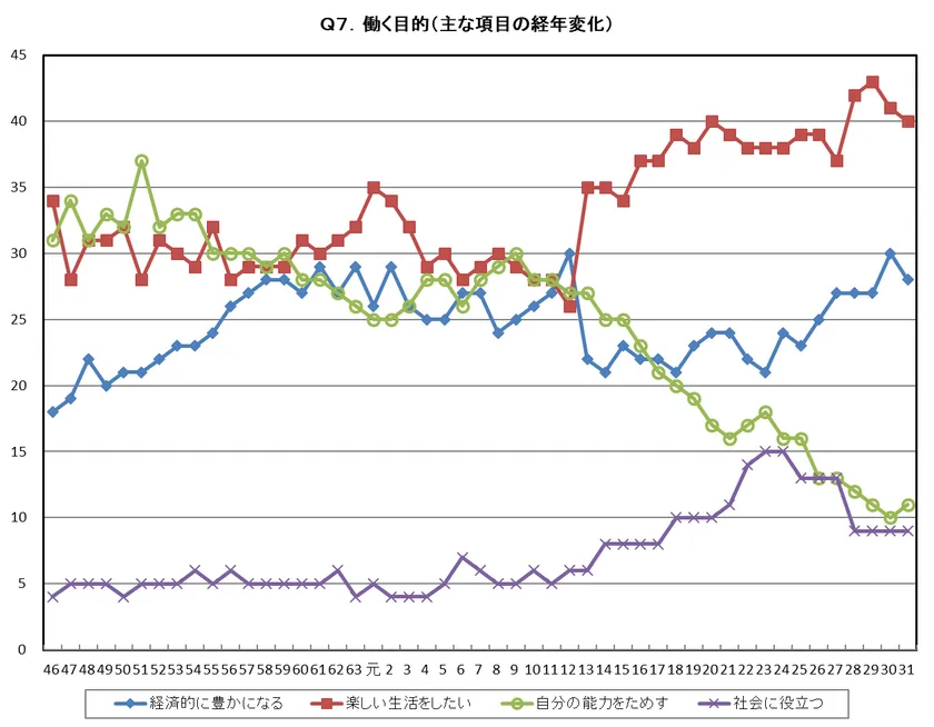 「働く目的」(Q7)で最も多い回答は、平成12年度以降急増した「楽しい生活をしたい」で39.6%だった。過去最高を更新した一昨年度の42.6%から2年連続で減少した。一方、かつてはバブル期を除いてトップになることもあった「自分の能力をためす」は長期にわたって減り続け、昨年度10.0%と過去最低を更新したが、今年度は10.5%とわずかに増えた。また、平成に入ってから平成23年頃まで増加していた「社会に役立つ」は減少し、横ばい傾向にある(今年度9.3%)。また、このところ増加していた「経済的に豊かになる」は、昨年度の30.4%から今年度28.2%に減少した。