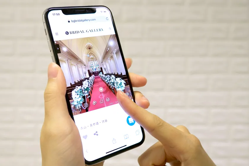 BGが提供する『バーチャルツアー』は、スマホで結婚式場を見学できる、国内ブライダル業界初(※)のサービスです。2019年6月25日時点で首都圏の人気式場100件以上を掲載しており、館内のチャペル・披露宴会場を見学することができます。