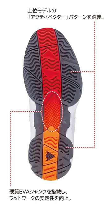 シャンクを搭載し、安定性の向上を図るとともに、ソールパターンは上位モデル「アクティベクター」のコンセプトを踏襲。あらゆるテニスの動作に対応できるようなパターン配置を採用しています。