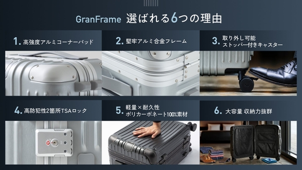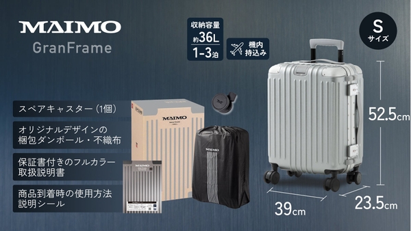 株式会社KURUKURUは、トラベルブランド「MAIMO」より、新作スーツケース『GranFrame(グランフレーム)』を2025年5月16日より発売いたします。堅牢なアルミフレームとコーナーパッドに、軽量なドイツ製ポリカーボネートボディを組み合わせ、耐久性と軽さを両立。見た目にはアルミ調の上質な質感を施し、ビジネスにも旅にも自然と馴染む洗練された佇まいに仕上げました。構造美と実用性を兼ね備えた、“持つ人の印象を引き立てる”一台です。
