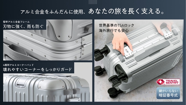 刃物に強く、水濡れにも配慮されたアルミ合金フレームに加え、衝撃を受けやすい四隅にはアルミ製コーナーパッドを配置。大切な荷物を多方向からしっかりと守ります。また、TSAロックを2ヶ所に備え、施錠したまま預け入れが可能。鍵を使わない暗証番号式のため、紛失の心配もなく、防犯性と利便性を両立しています。