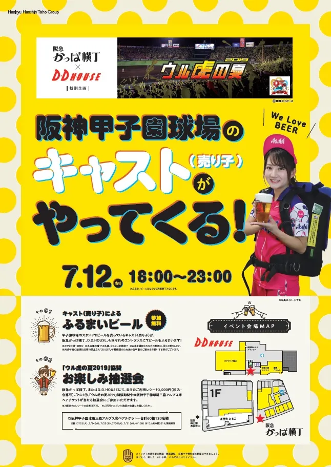 大阪梅田にある商業施設「阪急かっぱ横丁」と「D.D. HOUSE」による特別企画!7月12日(金)に、阪神甲子園球場のキャスト(売り子)による“ふるまいビール”イベントと、阪神甲子園球場のチケットが当たる“お楽しみ抽選会”を開催いたします。