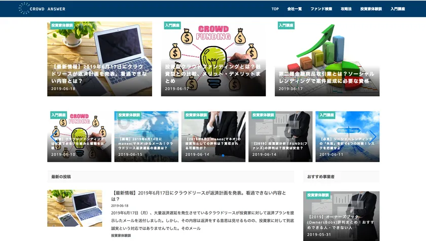 そこで、投資未経験者のためのソーシャルレンディングとは?といった基礎知識から、各ソーシャルレンディング事業者や貸付先の情報などのリスクを管理するための情報、既に投資を始めている方たちに向けた中級者向けのテクニックなど、投資家様向けの様々な情報をより正確にお届けすべくこの度「クラウドアンサー」としてサイトリニューアルを行いました。