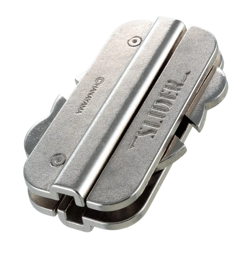 『はずる キャストスライダー』は、金属製立体パズル『はずる』シリーズの最新作で、フィンランドのパズルデザイナー、ヴェサ・ティモネン(Vesa Timonen)氏による、一見パズルとは思えない洗練されたシンプルなデザインになっています。