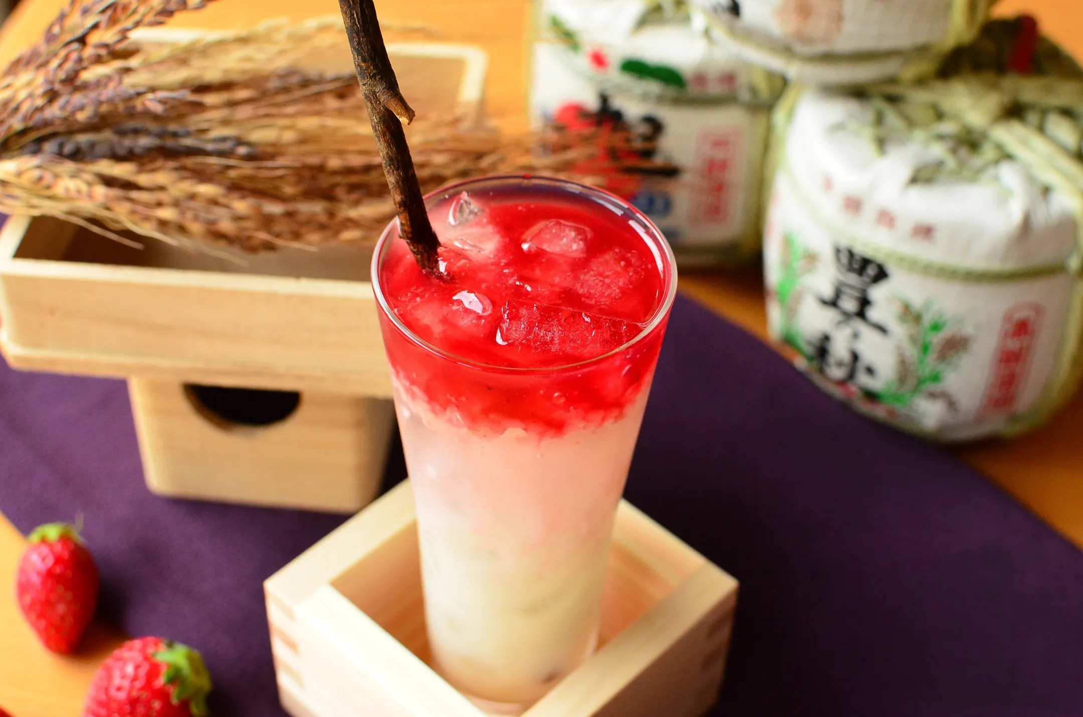 島根県では毎年、秋になると五穀豊穣に感謝する秋祭りなどで奉納神楽が盛んに行われています。界 出雲では毎夜、伝統芸能 石見神楽「大蛇」の演目を披露しています。演目の中で、ヤマタノオロチを退治するためにクシナダ姫がお酒をかき混ぜて造る場面があります。酒造りの起源ともされているその場面を見ながら、白い甘酒とイチゴのフルーツソースを「しゃかしゃか」と音を立ててかき混ぜると、いちごの食感が残るピンクのかわいい甘酒ができあがります。まるで神楽の一場面に自分が参加したような気分になり、伝統芸能を身近に感じることができます。(*日本酒は使用していません。)