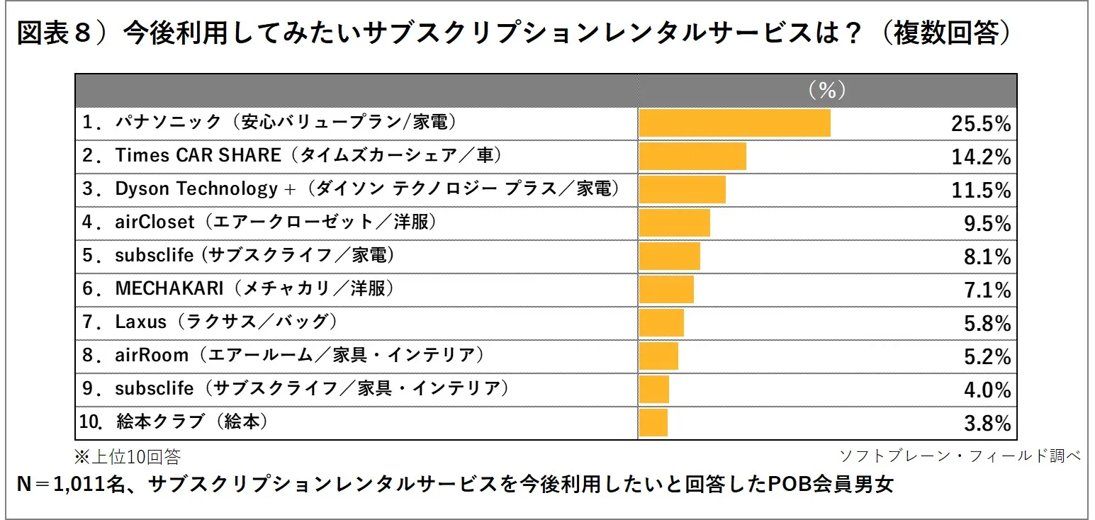 次に、今後利用してみたい「サブスクリプションレンタルサービス」を尋ねると、パナソニック製の最新TVを定額でレンタルできる「1.パナソニック(安心バリュープラン/家電)」が25.5%でもっとも支持を集め、次いで、カーシェアリングの「2.Times CAR SHARE(タイムズカーシェア/車)」が14.2%、「3.Dyson Technology +(ダイソン テクノロジー プラス/家電)」が11.5%と続きました。他にも、「4.airCloset(エアークローゼット/洋服)」9.5%、や「7.Laxus(ラクサス/バッグ)」5.8%などといった、女性をターゲットにしたファッションやブランドバックのレンタルサービスなどがランクインしました。