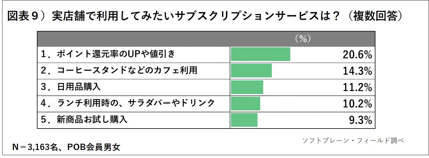 ・実店舗で利用してみたいサブスクリプションサービスは、「1.ポイント還元率のUPや値引き」が20.6%で最多となり、5人に1人の方が回答した。(図表9)