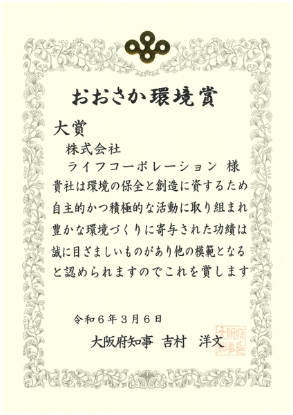 “おいしい” “ワクワク” “ハッピー” をお届けするライフコーポレーションは、「令和5年度おおさか環境賞(主催:大阪府、審査:大阪府環境審議会環境・みどり促進部会)」の事業者活動部門において、当社の「持続可能で豊かな社会の実現に貢献する食品廃棄削減のための取り組み」が『大賞』を受賞いたしました。