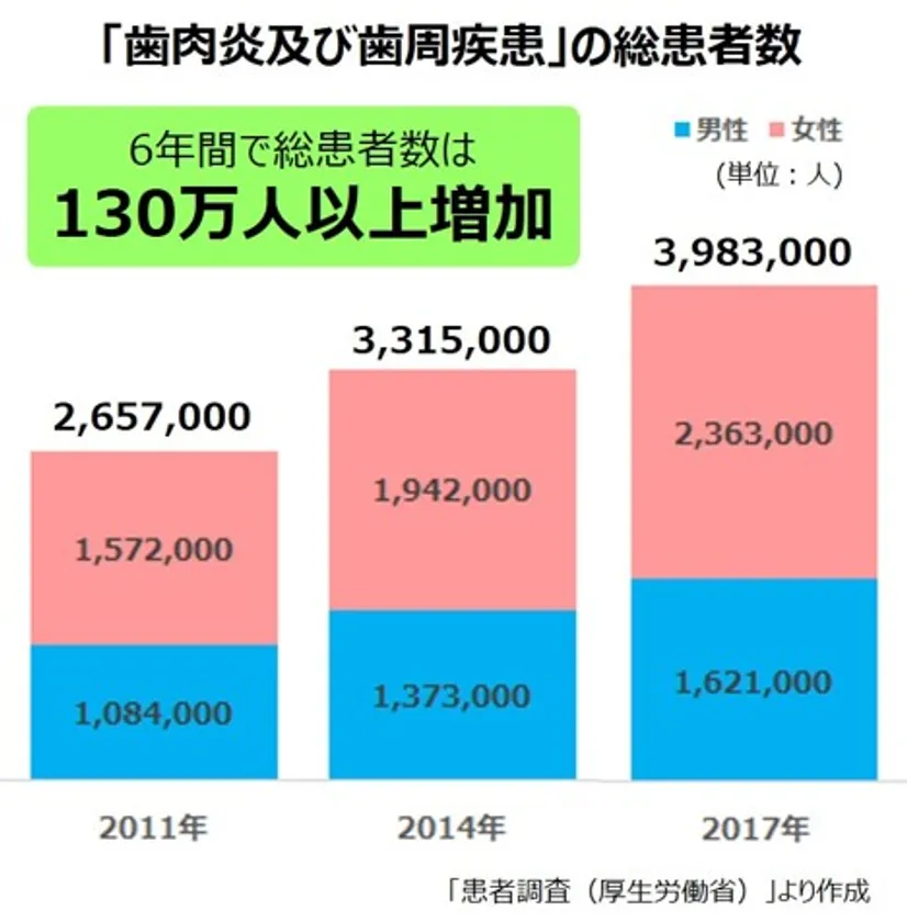 厚生労働省が3年に1度行っている「患者調査」によると、2011年から2017年の直近6年間でなんと130万人以上も歯肉炎や歯周疾患の患者は増加。その内訳をみると、男性よりも女性の割合が多いことが分かります。
