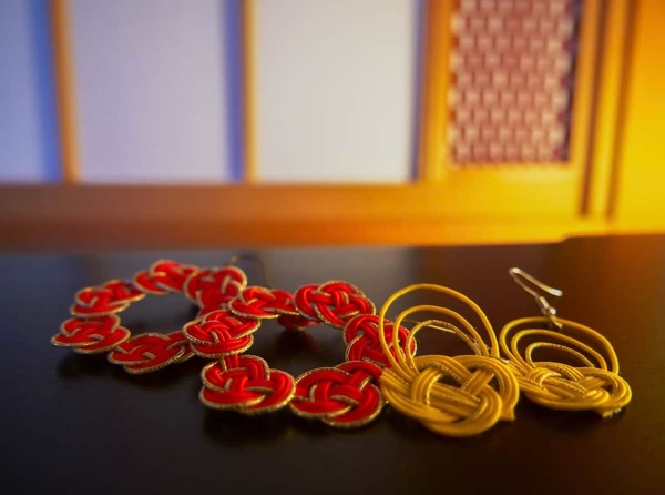 美しく華やかな結納飾りの「加賀水引」。いくつもの紐を丁寧に結んでアクセサリーを作る体験セットを用意します。根気のいる作業ですが、時間を忘れて没頭でき、完成した時には達成感が得られる体験です。