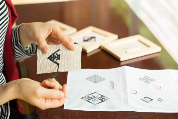 美しいシンメトリーな模様がモダンにアレンジできると人気の青森の伝統工芸「津軽こぎん刺し」。界 津軽では、滞在中に好きなだけ刺繍体験ができる貸出キットを用意します。