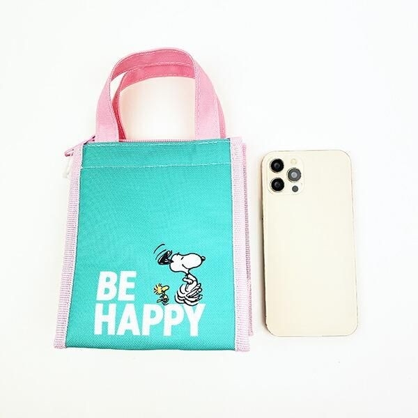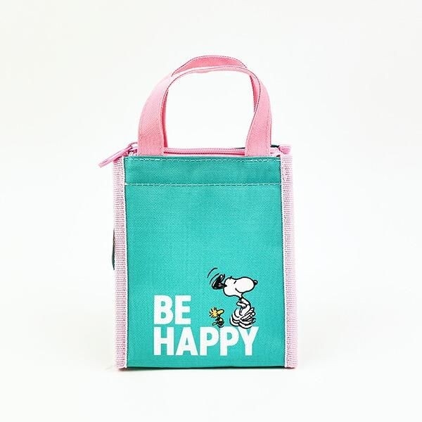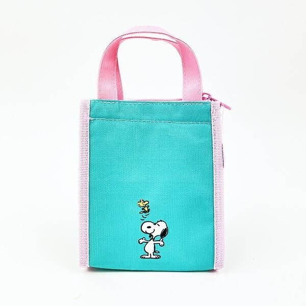 まずは スヌーピー スクエアランチバッグ(SS) 。爽やかなミントグリーンとキュートなピンクのバイカラーデザインが最高にオシャレなデザインのランチバッグです!