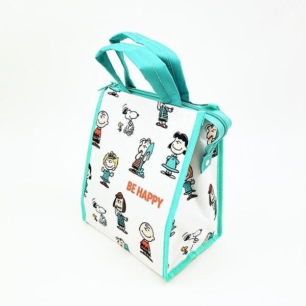 こちらはバージョン違いです。メインがアイボリーで、ミントカラーが持ち手やサイドのパイピングに入ったバイカラーのデザインのランチバッグです。ピーナッツの仲間たちが散りばめられた賑やかな総柄イラストが楽しいですね。