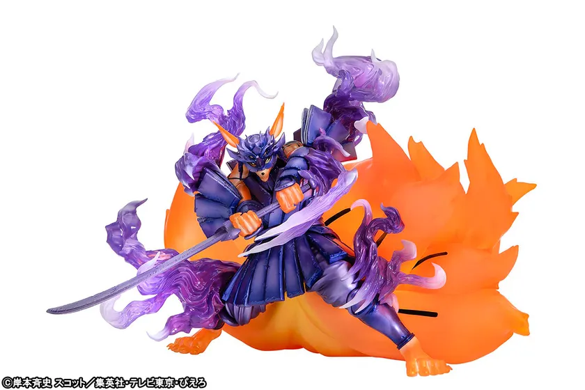 BORUTOファンの心に残る名シーン「モモシキvsナルト サスケの共闘シーン」で繰り出された共闘技を大迫力のポージング、彩色、ボリュームで立体再現しました。二人のチャクラが具現化し、須佐能乎を身にまとい大刀をフルスイングする九喇嘛を全長約32cm、全高約28cmのサイズで再現。可視化したナルトのチャクラ(橙色)とサスケのチャクラ(紫色)をあらわしたクリアパーツの造形と彩色にも注目です。また、ナルトとサスケのミニアクリルマスコットが付属します。