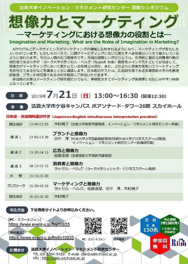 法政大学イノベーション・マネジメント研究センター、 国際シンポジウム「想像力とマーケティング ―マーケティングにおける想像力の役割とは―」を 7月21日(日)に市ケ谷キャンパスで開催