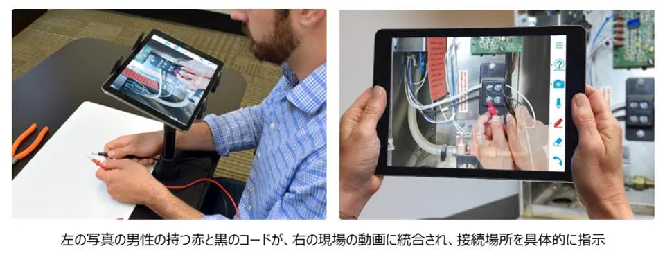 現場の作業者と遠隔地の説明者のそれぞれのビデオストリーミング動画を融合することにより、あたかもその場で説明者が身振りや手振りを用いて、具体的にどの部分を、どのように修理すればいいかといったことを解説するかのように、視覚的に作業者をサポートすることが可能です。