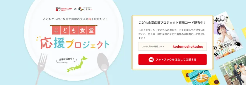 また、プロジェクト専用ページに記載されているクーポンを使用して当社のフォトブックを購入すると、そのプロジェクトの売上の一部を、「NPO法人むすびえ」を通じて全国のこども食堂に寄付します。