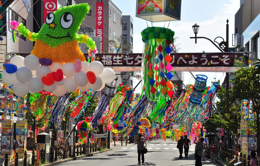 昭和26年に仙台七夕まつりをモデルとして開催された福生七夕まつりは、今年で69年目を迎える西多摩地域を代表するお祭りであり、毎年市内外から約40万人が来場します。商店街の各店舗などが工夫を凝らして作成した豪華で色とりどりの竹飾りが市内中心部に飾り付けられ、街中が七夕一色になることで知られます。また、米軍横田基地が隣接している特色から、七夕まつりではアメリカンなイベントや装飾が多くみられ、伝統的な日本文化と異文化の交わりを表現した「福生らしい」七夕まつりとして毎年賑わいを見せています。