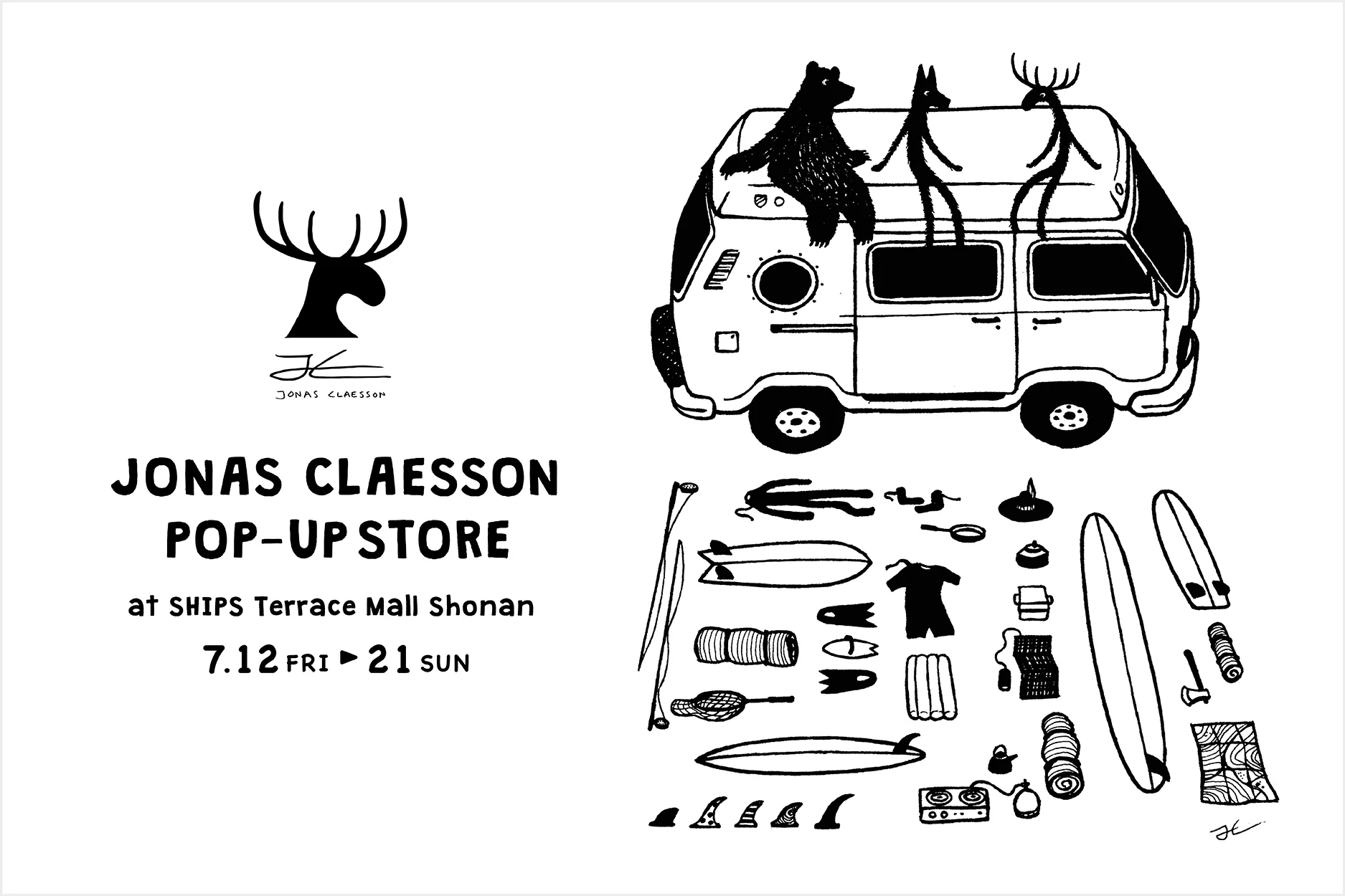 初シーズンとなる今回、SHIPS テラスモール湘南店ではSHIPS別注Tシャツに加え、通常取り扱いの無いアイテムを豊富に揃えたJonas Claesson POP-UP STOREを7/12(金)より期間限定で開催致します。