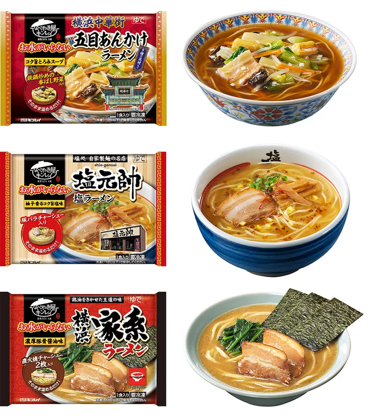 株式会社キンレイ(本社:京都市伏見区、代表取締役社長:和田 博行)は、「お水がいらない」シリーズより、「お水がいらない 五目あんかけラーメン」「お水がいらない 塩元帥 塩ラーメン」「お水がいらない 横浜家系ラーメン」を2019年秋冬向け新商品として2019年8月26日(月)より全国の量販店の冷凍コーナーにて順次発売します。