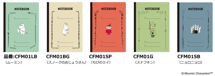 好奇心旺盛なムーミン、おしゃれが大好きなスノークのおじょうさん、ちっちゃくて怒りっぽいちびのミイ、自由と孤独を愛するスナフキン、不思議な生き物ニョロニョロの全5柄。用途や科目など使い分けが楽しくなるラインナップです。