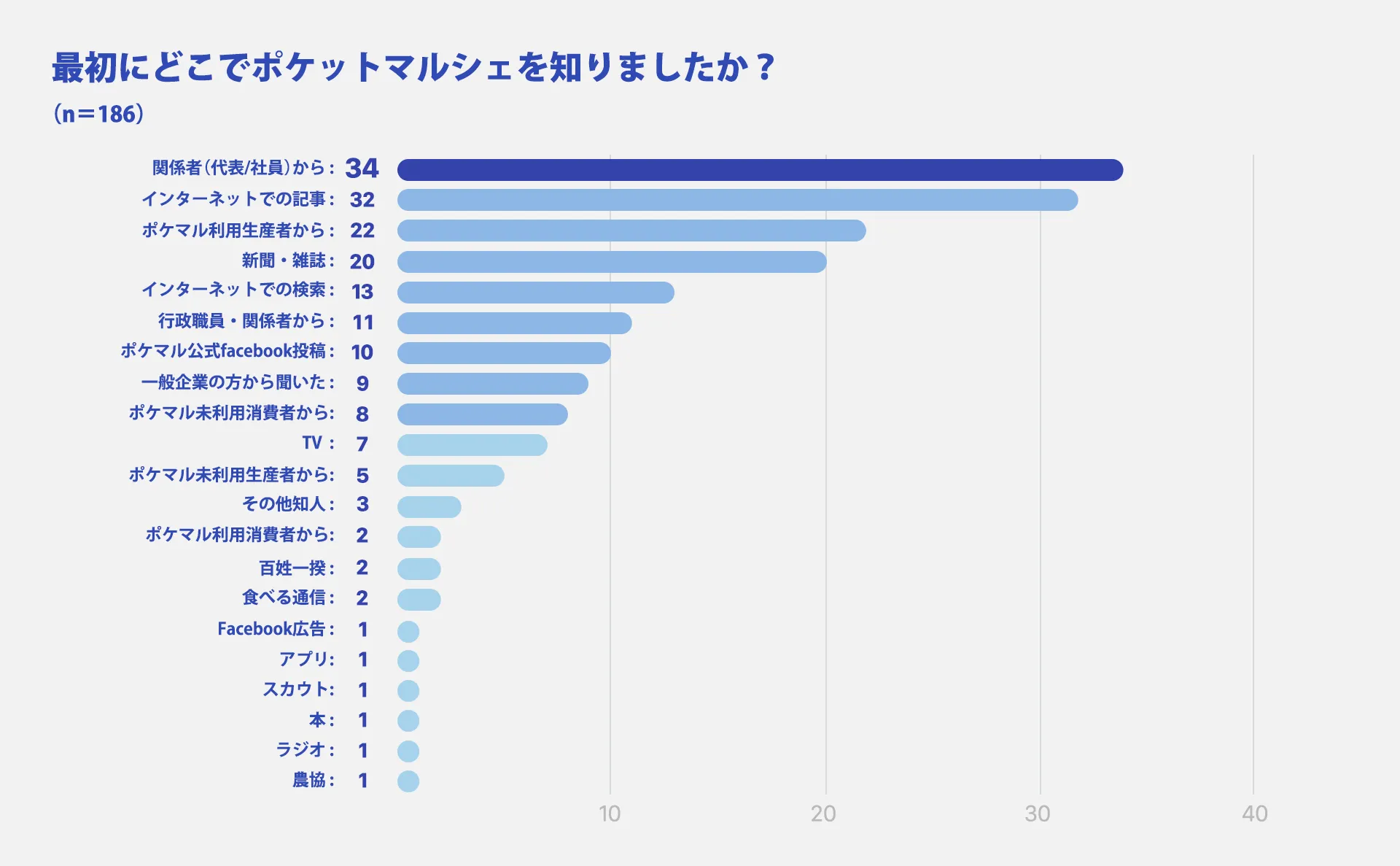 最初にポケットマルシェを知ったきっかけとして最も多いのは「関係者(代表/社員)から」の情報提供で、次いで「インターネットでの記事」「ポケマル利用生産者から」という結果になりました。