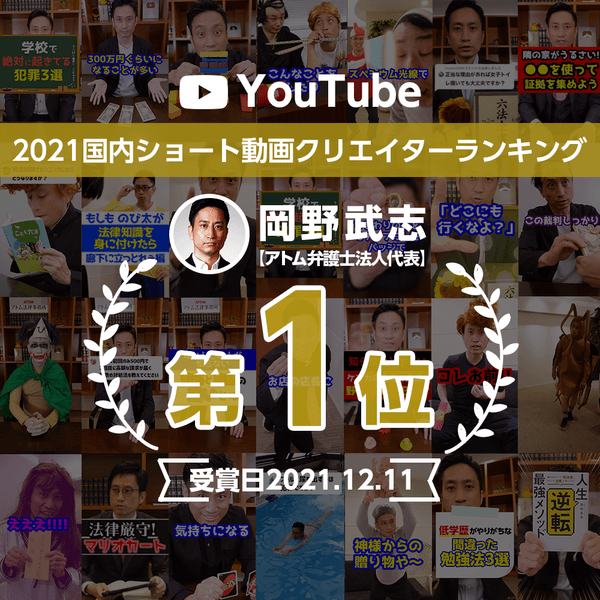 YouTube FanFest 2021 JAPANにおいて国内ショート動画クリエイターランキングが発表されました。同ランキングにおいて『岡野タケシ弁護士【アトム法律事務所】』が1位を獲得しました。