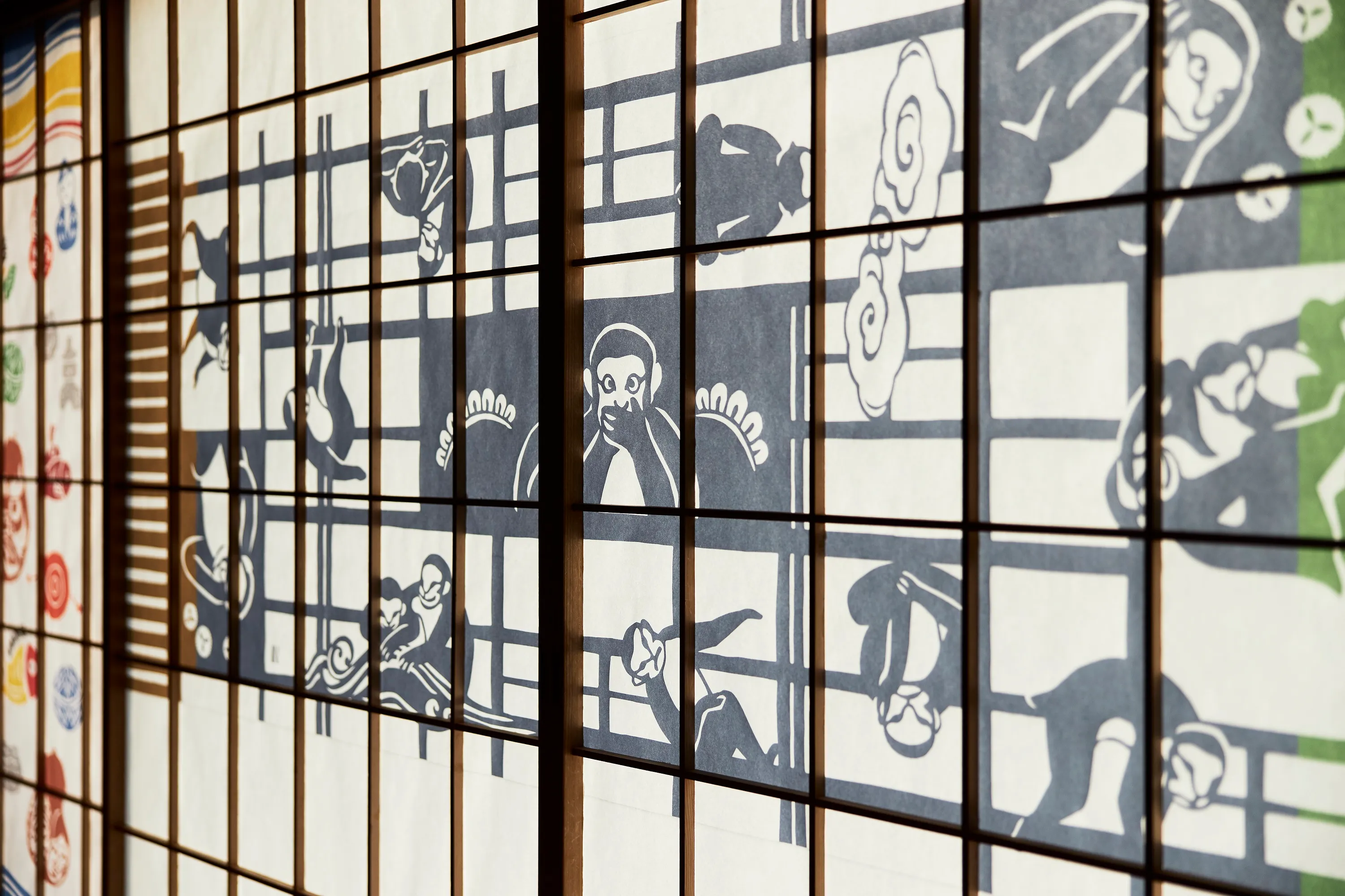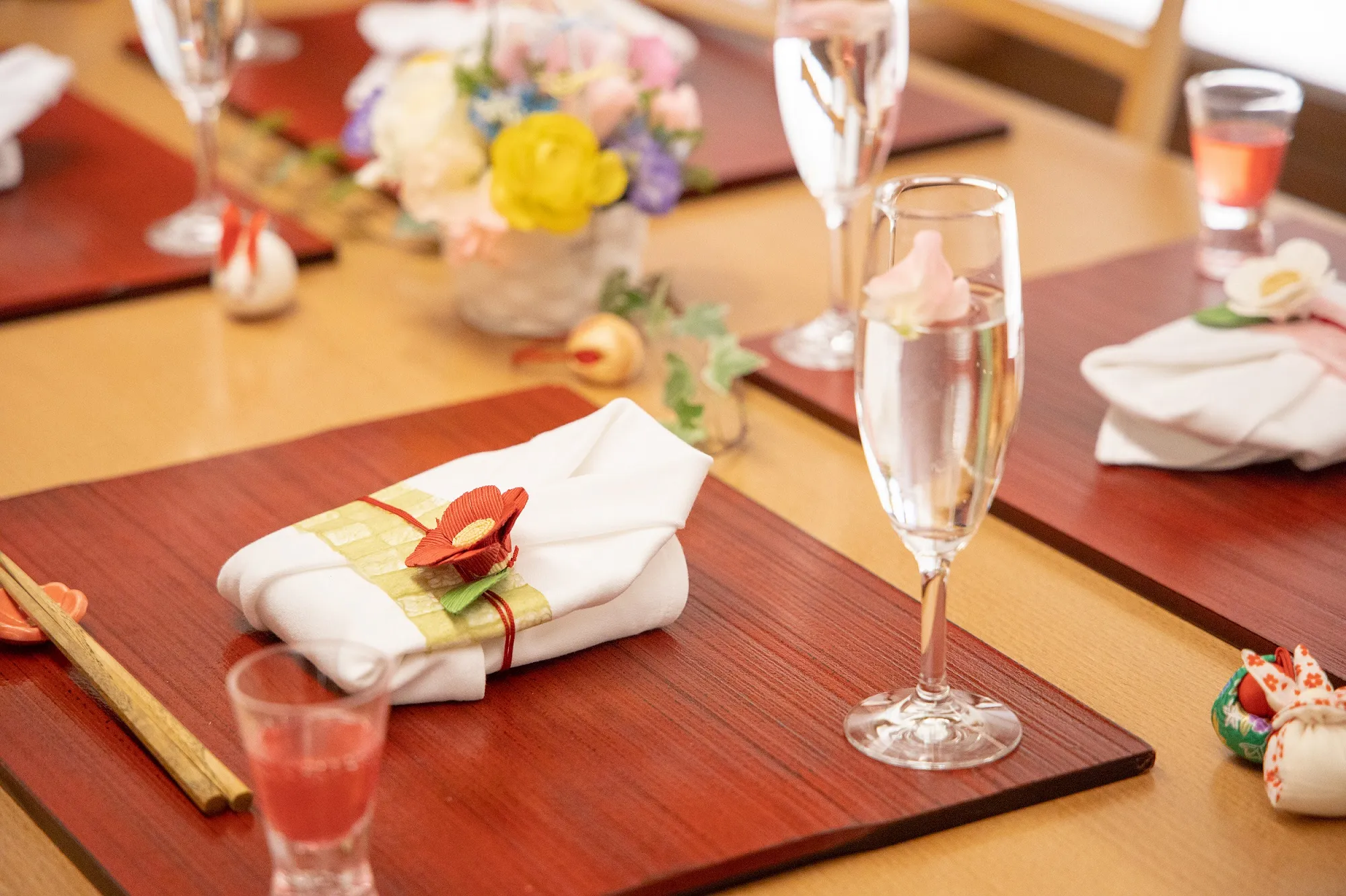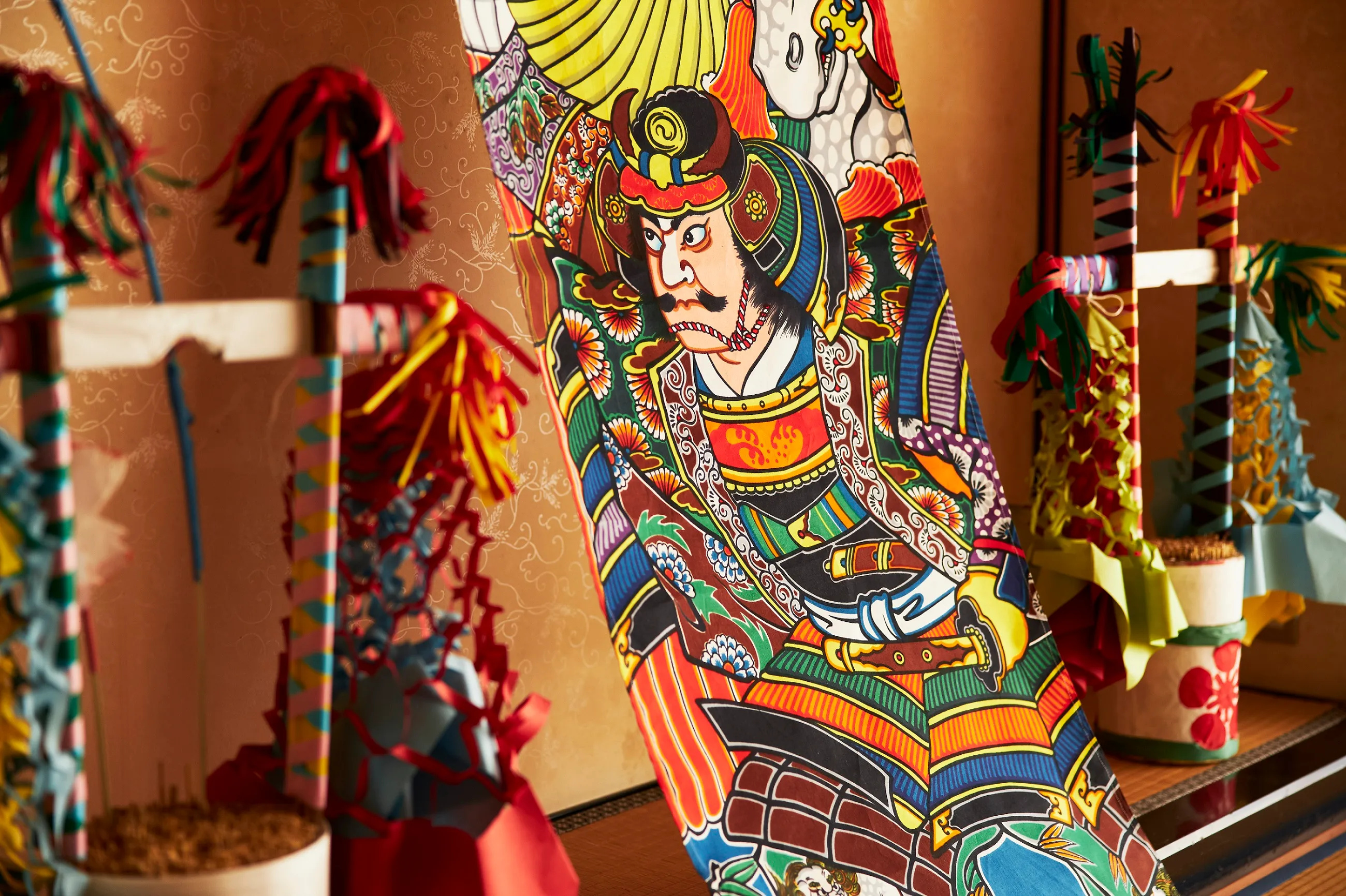 本プランのために特別に設えた夕食の個室は、ご当地の縁起物で装飾します。東照宮にまつわる三猿や、栃木に古くから厄病除けとして伝わる黄ぶなといった可愛らしい動物たちが出迎えます。さらに勇壮な武者絵、子どもの成長を願う麻の葉模様の鹿沼組子、七歳の女の子が主役の伝統行事「花桶かつぎ」で使う神聖な花桶など、縁起の良い栃木の伝統工芸品と触れ合いながら食事を楽しめます。