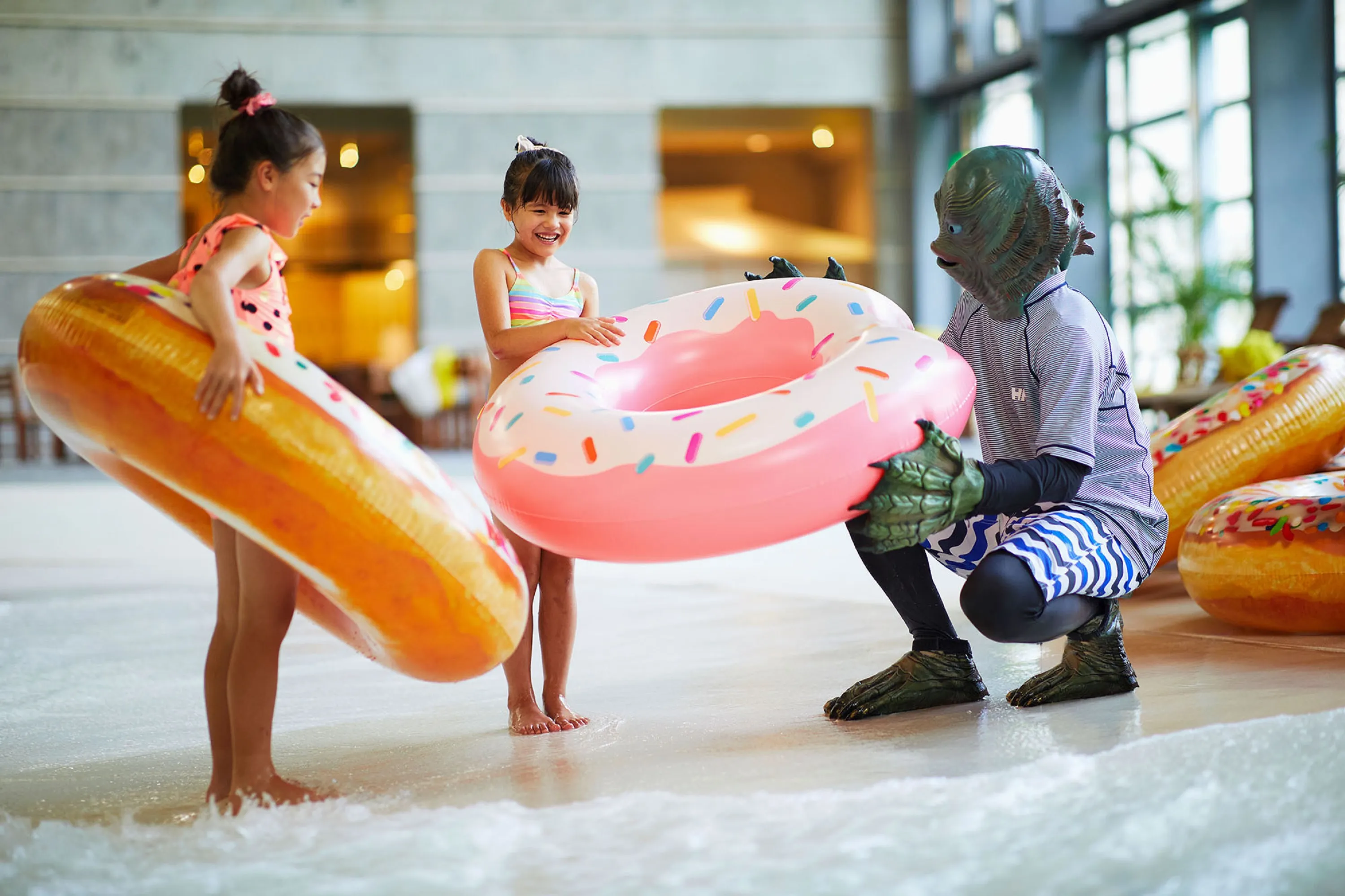 屋内プール「イルマーレ」では、「半魚人のプールデビューサポート」を実施します。半魚人は子どもが水に慣れることができるよう、ジェスチャーや魚のおもちゃを使い、プールの楽しみ方を教えます。また、半魚人は気まぐれに登場し、「トリック・オア・トリート」という合言葉で、お菓子の代わりにドーナツやキャンディーなどお菓子形のフロートをレンタルします。