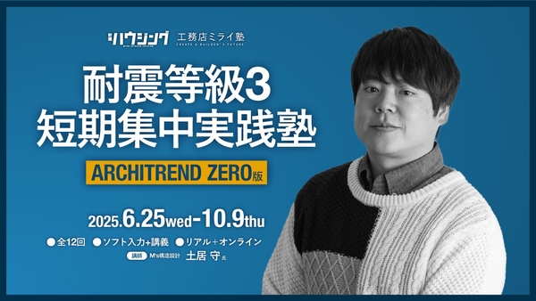 新建ハウジングでは、6月25日(水)から工務店ミライ塾『耐震等級3 短期集中実践塾[ARCHITREND ZERO版]第4期』を開講いたします。