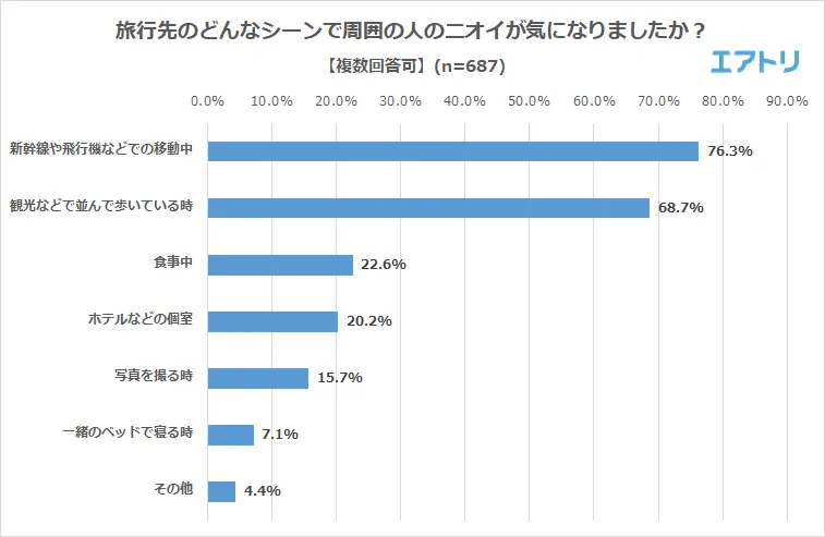 旅行先で周囲の人のニオイが気になったシーンを聞いたところ、自分のニオイが気になるシーンと同じ「新幹線や飛行機などでの移動中」(76.3%)、「観光などで並んでいる時」(68.7%)が半数以上の回答を集め、自分のニオイより周囲の人のニオイが気になる人の方が多いことが分かりました。