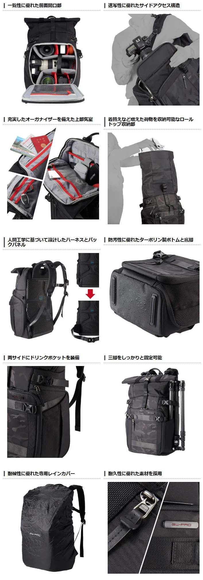 「GW-PRO RED」シリーズは、被写体を求めて海外を飛び回る、スタジオ撮影に向けて大量の機材を運ぶ、日常の中から一枚を切りとる、といったフォトグラファーのニーズに合わせた目的設計を徹底。重量のかさむカメラ機材の負担を軽減し、より多くの場面で利用しやすくなったハイエンドカメラバッグシリーズです。